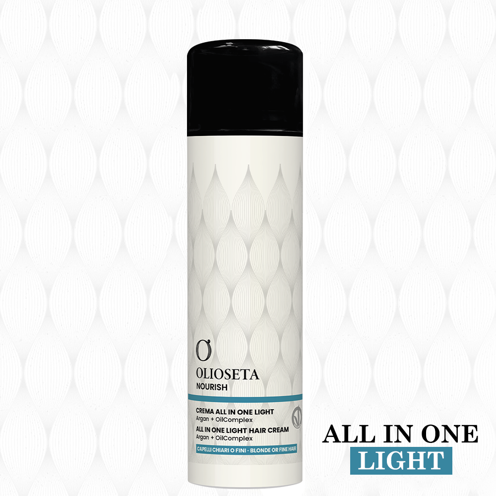 ALL IN ONE Light e леката версия на добре познатия бестселър на OLIOSETA — мултифункционален бутиков крем за коса ALL IN ONE. Специално разработен за фини, тънки и/или естествено руси коси, кремът осигурява безкомпромисно възстановяващо, защитно и дисциплиниращо действие, без да отнема от обема и да утежнява. Заздравява и хидратира косата в дълбочина, придавайки ѝ изключителен гланциращ блясък. Предотвратява появата на цъфтящи краища, защитава при термообработка и не позволява бухване при влажно време, като същевременно контролира наелектризирането.