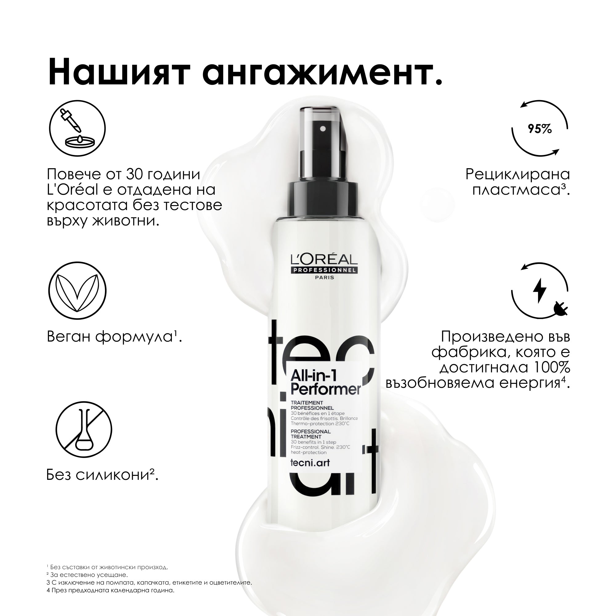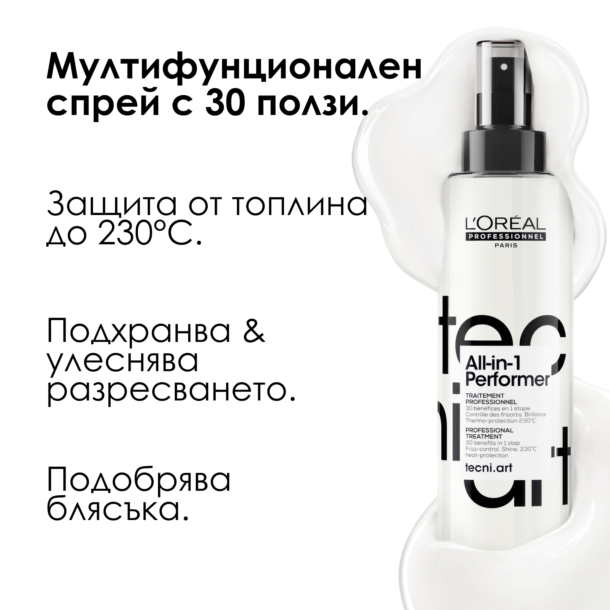 Мултифункционален спрей за коса Tecni Art All-In-1 осигурява 30 ползи за косата. Предлага 24-часов анти-фриз ефект, предпазва от топлина до 230°C и придава невероятен блясък. Идеален за всеки тип коса и стайлинг. Подготвя, предпазва и улеснява стилизирането на косата за безкрайни стайлинг възможности.