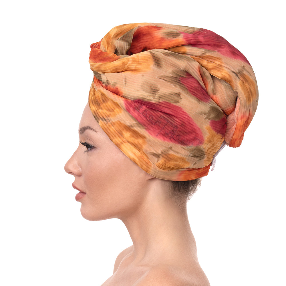 Външната част е изработена от полиестер – лек, устойчив и бързосъхнещ материал, който осигурява отлично предпазване на косата от външни фактори като вятър, прах и слънце. Гладката структура на полиестера намалява триенето при контакт с дрехи или повърхности и подпомага запазването на хидратацията в косъма. Практичната текстура прави кърпата Touch Treat подходяща за ежедневна употреба – у дома, след спорт, на плажа, по време на път или при активен начин на живот.