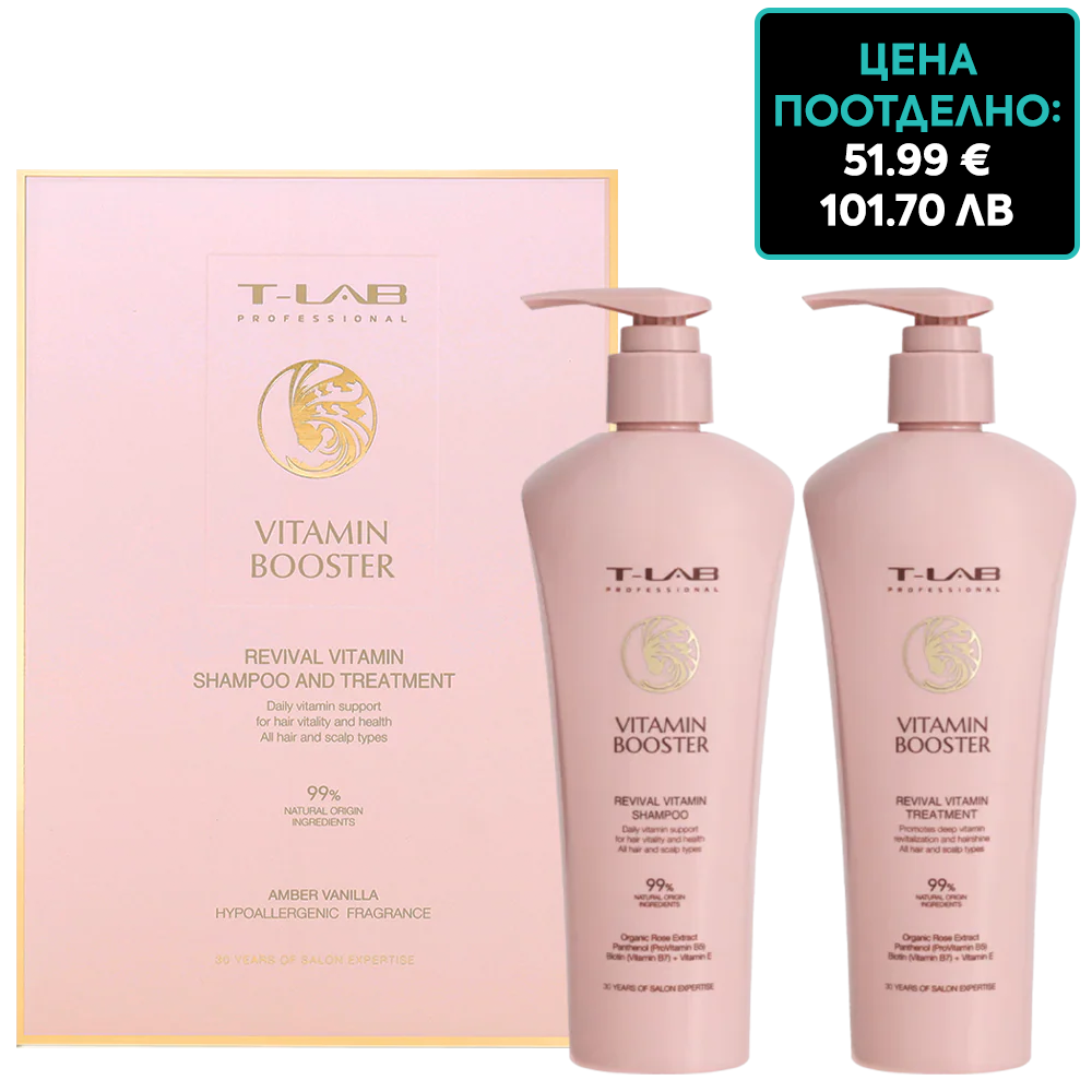 Възстановяващ шампоан с витамин-комплекс T-LAB Vitamin Booster Revival Shampoo нежно почиства скалпа и косата, като едновременно с това поддържа оптималните условия за растежа на здрава и силна коса. Съдържа активни органични съставки, които укрепват косъма и успокояват скалпа, правейки косата гладка и мека. Съдържа екстракт от органична роза, богат на витамини А, С и Е.