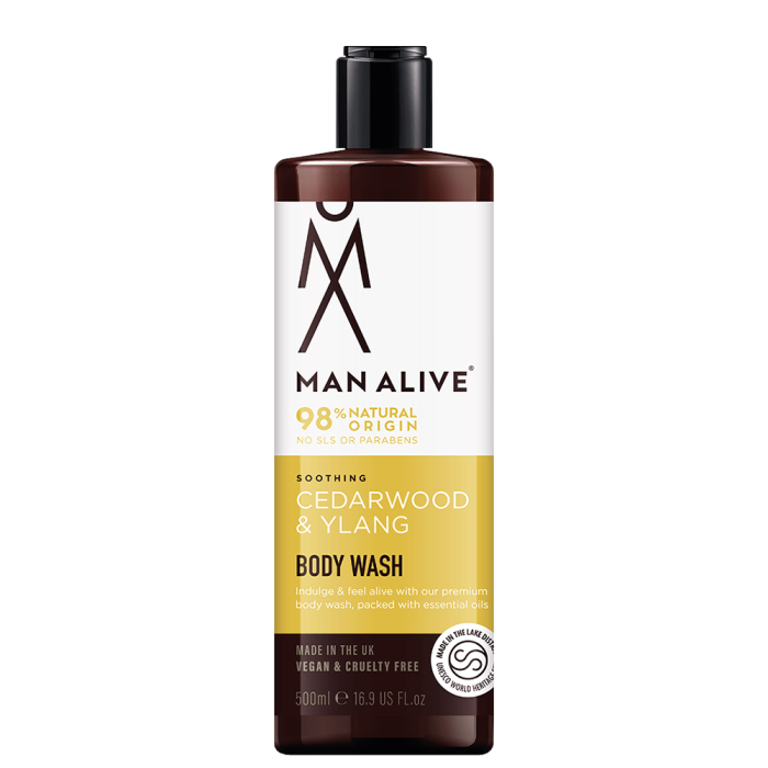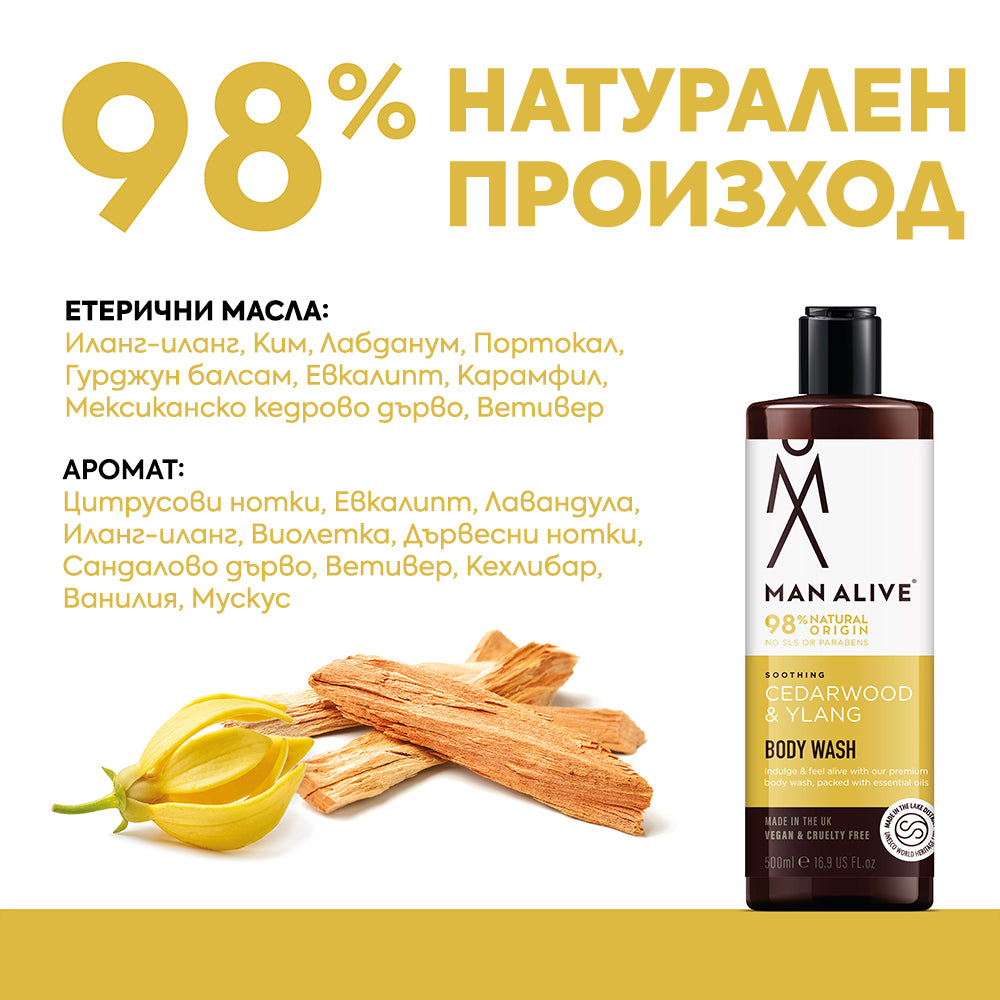 Успокойте сетивата с луксозния релаксиращ душ гел Man Alive Body Wash Cedarwood and Ylang, формулиран с висококачествени етерични масла и 98% естествено извлечени съставки. Отключете съзнанието си и се насладете на освежаващия мъжествен аромат.