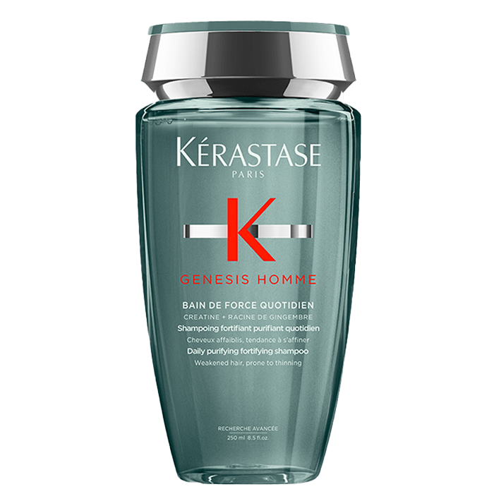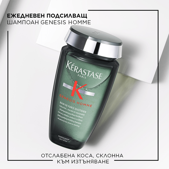 Обогатен с креатин и екстракт от джинджифил, се бори с косопада, причинен от отслабване на косата от корена, както и със загубата на коса, причинена от изтъняване на косъма. Почистващите агенти в шампоана образуват гъста, обилна пяна, която ефективно отстранява замърсяванията и излишния себум. Нежно почиства скалпа, косата и брадата, като ги хидратира и омекотява. С текстура на прозрачен гел, шампоанът дава усещането за чистота за по- дълго време и укрепва косата. Подходящ за коса, склонна към омазняване. Екстрактът от корен от джинджифил е известен със своите предпазващи от външната среда свойства. Креатинът благоприятства за създаването на електронните връзки в кортекса на косъма, като спомага за възстановяването и укрепването на структурата му от вътрешността. След 6 седмици употреба косопадът е намален, а косъмът е по-устойчив и защитен. Повече от 80%*от потребителите усещат скалпа си освежен, балансиран и енергизиран.