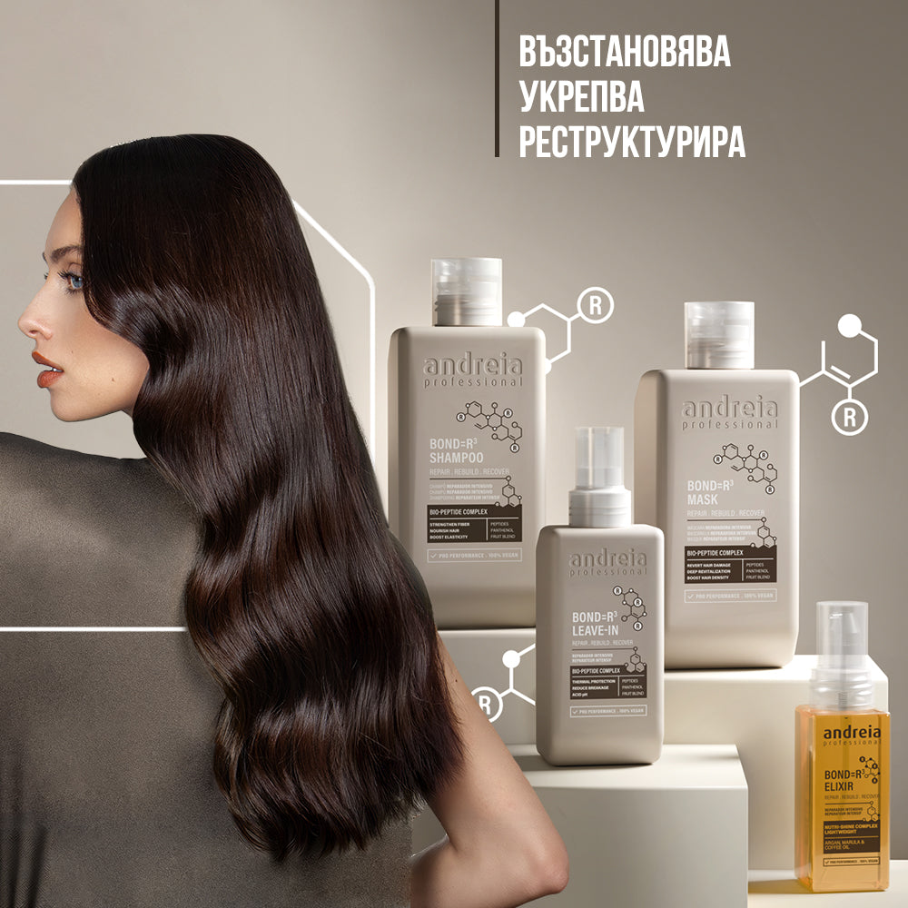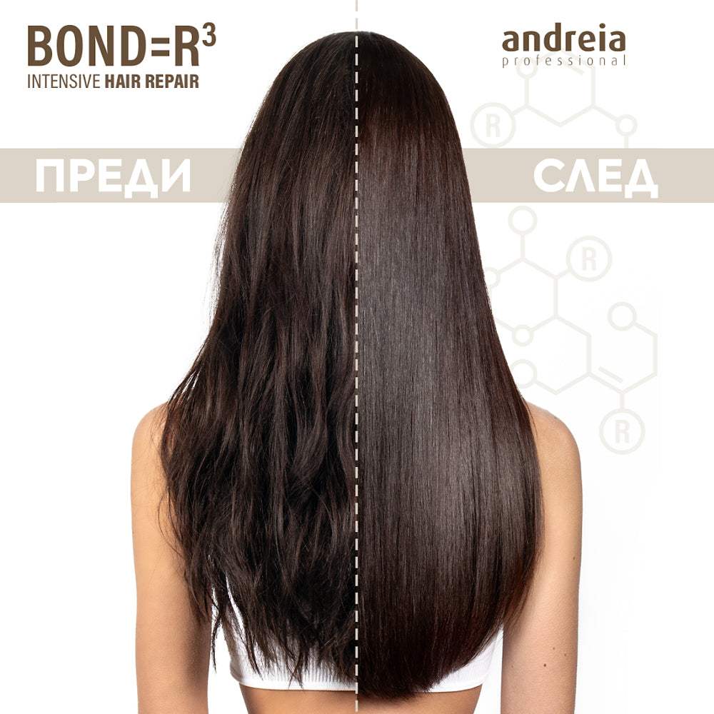 Интензивна терапия за възстановяване на косата Andreia Professional BOND=R³ действа директно върху молекулярната структура на косъма и дълбоко възстановява уврежданията. Укрепва кортекса, повишава плътността и еластичността, възвръща естествения блясък на косата.