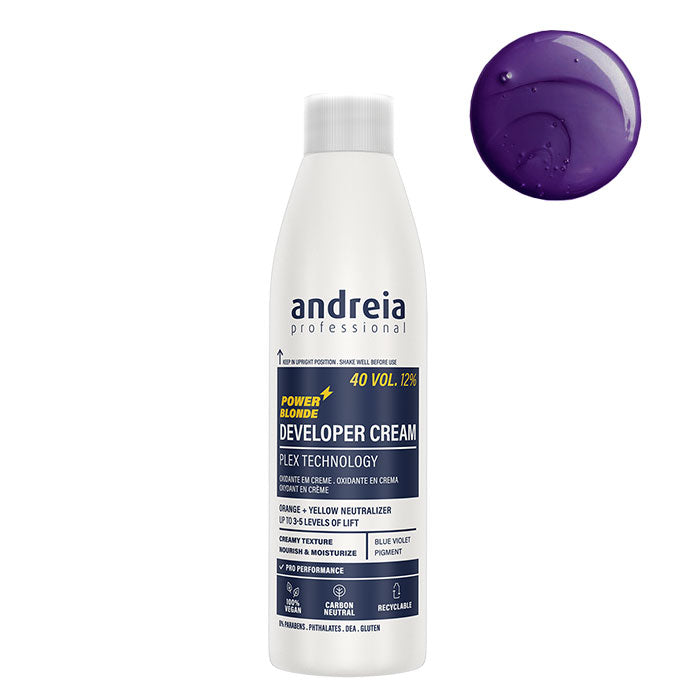 Оксидант за силно изсветляваща трайна боя и изрусители Andreia Professional. Формулиран с множество сини и виолетови микропигменти, оксидантът неутрализира нежеланите жълти и оранжеви оттенъци от русите коси. Хидратира и подхранва в дълбочина. Притежава лек аромат.